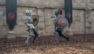 Y ahora que lo menciono, dragones. De momento han aparecido 4. Dos claros, los de Damon y Raenyra, y otros 2 de paso en una de las batallas. No soy muy fan del rojo, pero por lo que comentan es muy fiel al libro, lo que sin duda celebró. Todo lo que mantengan fiel, siempre es un plus.